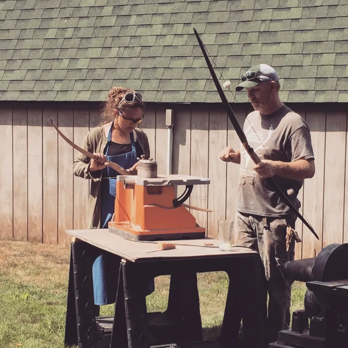 Chad Holm teaching Andri how to make a longbow. Photo by Brad Davis.