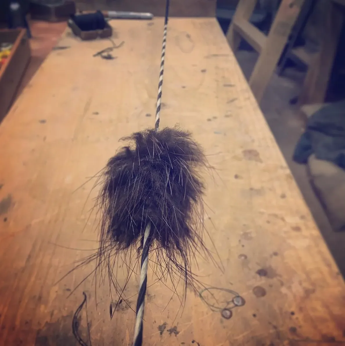 Stretching a flemish-twist string with Alaskan beaver-fur silencers. Photo by Andri Elko.